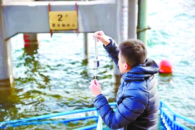 供水調度的正常開展,離不開水文人員的辛苦付出。早上8時許,懷柔水庫的氣溫在零下9攝氏度左右,水庫的水文取水點旁,京密引水管理處的水文人員李海春小心翼翼地順著臺階向水面走去,由于氣溫太低,臺階欄桿兩側已結了厚厚的冰柱,臺階上也因為積水成冰而變得異常濕滑。來到水邊,李海春掏出專業溫度計,順著繩子將它扔進水面?!盀榱藴y得更加準確,必須讓溫度計在里面至少待5分鐘。”李海春說。專業的水文溫度計有不銹鋼外表,可以抵擋零下十幾攝氏度的嚴寒。李海春雖然穿了羽絨服,但站在戶外,尤其是水邊,5分鐘也是相當的難熬。