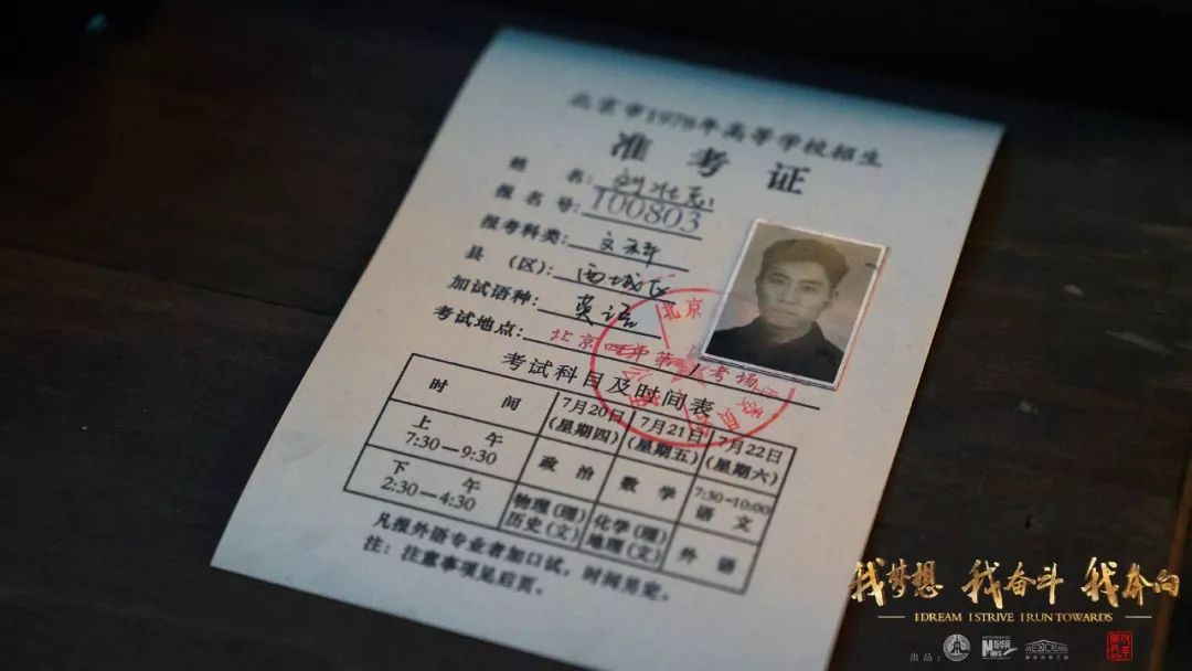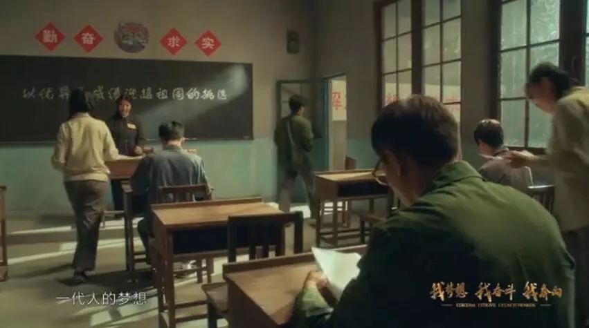 1978年高考恢復,中國由此重新迎來了尊重知識、尊重人才的春天。坐在1978年正在進行高考的教室里,考生劉燁寫下自己作文的最后一句話:“為祖國和人民不懈奮斗”。他在鏡頭前書寫下“奮斗”二字,體現了那個年代的人渴望建設祖國的一腔熱血。