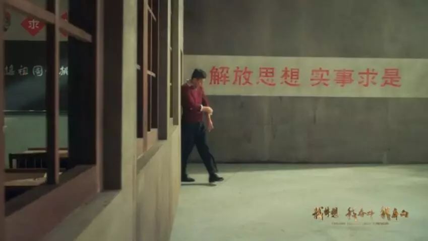 ??? 片中人們喜迎大會,共同分享這一紀念性的時刻,我們看到的背景墻上寫著“解放思想,實事求是”體現了時代精神。警察、郵遞員、工廠女工、老人、學生和年輕人的服裝,按照當年的樣式進行還原,并且全部進行重新制作,完全還原了當時的場景。