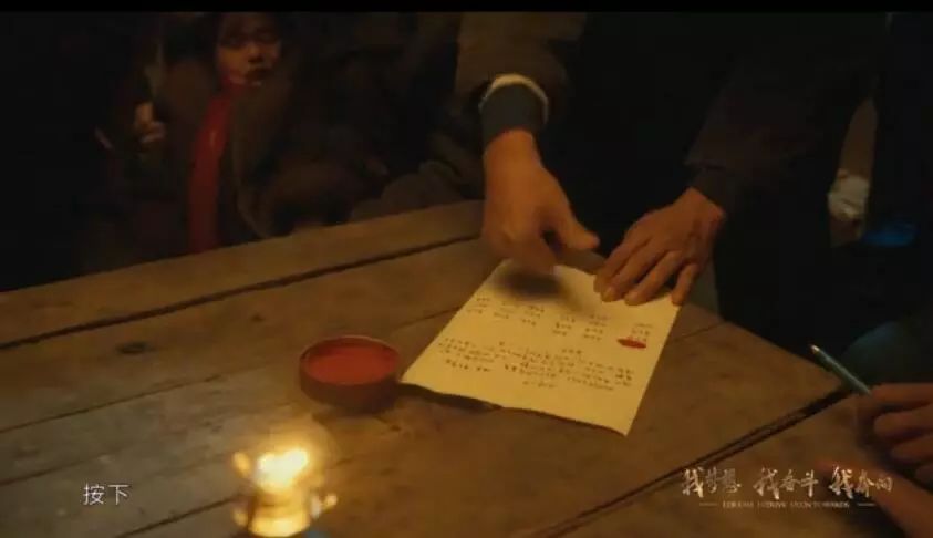 小崗村的變革,有多少人是通過那幅油畫了解到當時的場景的,這一次我們讓油畫“動了”起來。在畫面中,所有演員的站位,包括后來進來的劉燁,都精準地參照并還原了小崗村油畫的畫面。變身農民的劉燁提著馬燈偷偷進入屋內,詢問過后,率先在責任書上按下手印,畫面中的責任書是以博物館中保存的原版責任書為參考,完全臨摹后制作的道具,整個道具細致到了每一位農民按手印的位置。