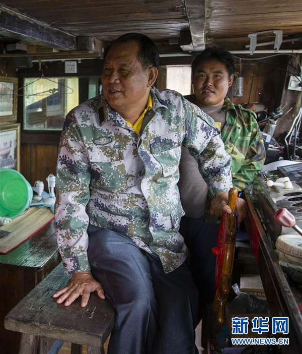 11月14日,在海南省瓊海市潭門鎮(zhèn),王書茂(左)在漁船上。 新華社發(fā)(宋國強(qiáng) 攝)