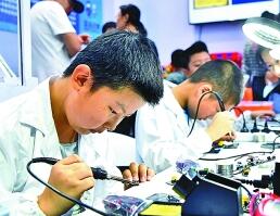 2018世界機器人大會上,小學生在焊接用于編程的模塊。新華社發