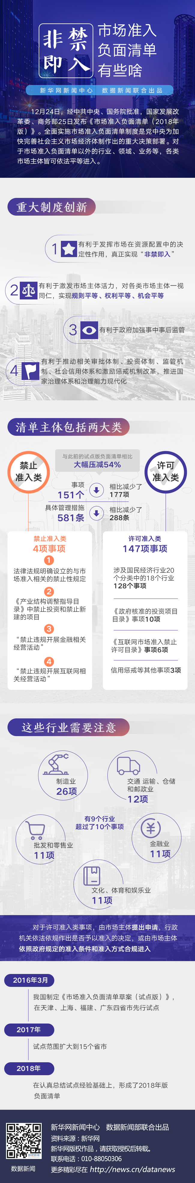 隨著《市場準入負面清單(2018年版)》25日正式公布,我國市場準入負面清單制度進入全面實施新階段,實現清單之外所有市場主體“非禁即入”。