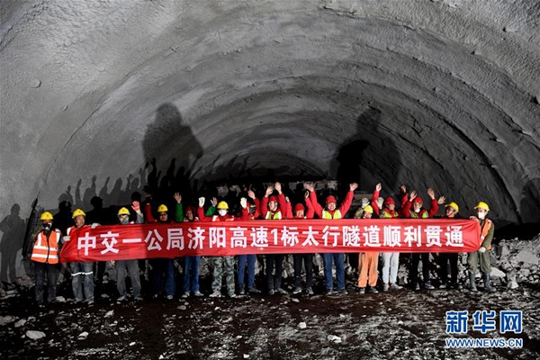 12月26日,中交一公局工程建設(shè)者在濟(jì)陽高速公路穿越太行山隧道群施工現(xiàn)場慶祝隧道貫通。新華社記者 朱祥 攝