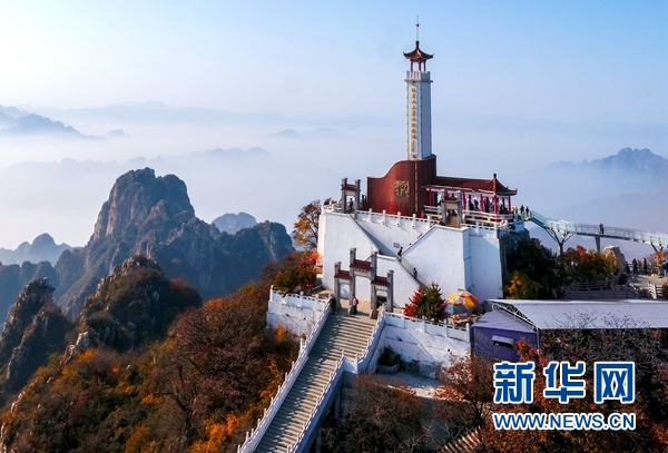 這是狼牙山棋盤陀峰頂?shù)摹袄茄郎轿逵率考o(jì)念塔”(2017年10月27日無人機拍攝)。 新華社發(fā)