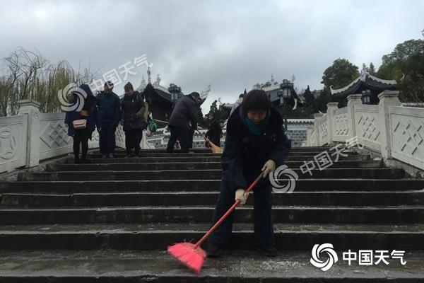 昨天上午,貴陽甲秀樓景區工作人員正在清掃浮玉橋上的結冰。(楊春竹 攝)