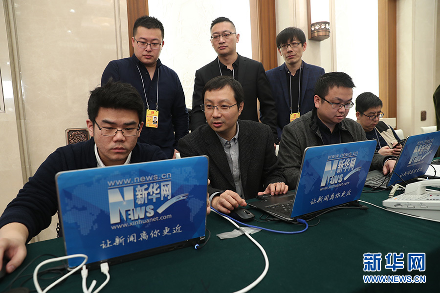 全國政協(xié)十三屆一次會議新聞發(fā)布會3月2日16:30在人民大會堂一層新聞發(fā)布廳召開,大會新聞發(fā)言人王國慶向中外媒體介紹本次大會有關(guān)情況并回答記者提問。圖為發(fā)布會前新華網(wǎng)直播團(tuán)隊(duì)進(jìn)行準(zhǔn)備工作。新華網(wǎng)/中國政府網(wǎng) 翟子赫攝