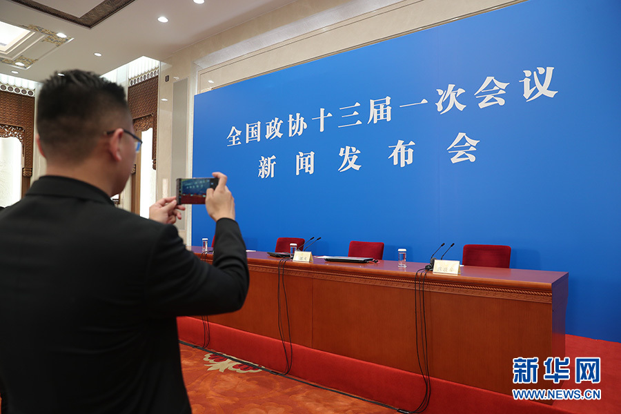 全國政協十三屆一次會議新聞發布會3月2日16:30在人民大會堂一層新聞發布廳召開,大會新聞發言人王國慶向中外媒體介紹本次大會有關情況并回答記者提問。圖為發布會前記者在現場拍攝。新華網/中國政府網 翟子赫攝