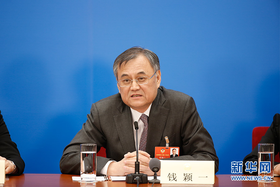 全國政協十三屆一次會議3月8日15:00在人民大會堂新聞發布廳舉行第二場記者會,邀請中央財經領導小組辦公室副主任楊偉民,中國進出口銀行董事長、黨委書記胡曉煉,農業部原副部長陳曉華,全國工商聯副主席、清華大學經濟管理學院院長錢穎一,中國中化集團有限公司黨組書記、董事長寧高寧就推動經濟高質量發展回答記者提問。圖為全國工商聯副主席、清華大學經濟管理學院院長錢穎一。新華網/中國政府網?陳杰 攝