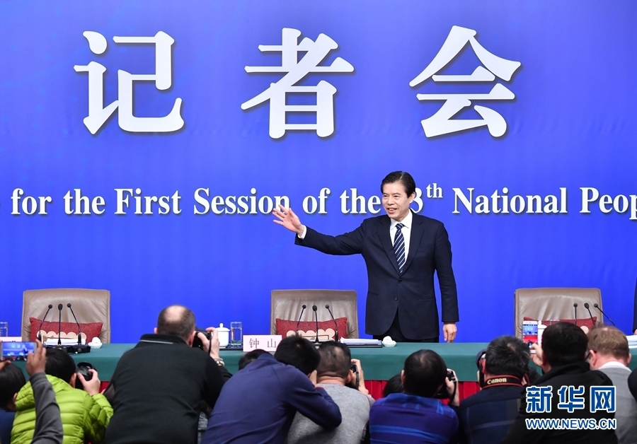 3月11日,十三屆全國人大一次會議新聞中心舉行記者會,邀請商務(wù)部部長鐘山、副部長兼國際貿(mào)易談判副代表王受文、副部長錢克明就“推動形成全面開放新格局推動商務(wù)事業(yè)高質(zhì)量發(fā)展”相關(guān)問題回答中外記者提問。這是鐘山向記者揮手致意。 新華社記者 李鑫 攝