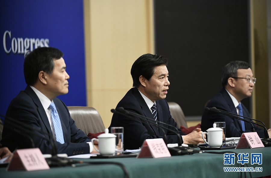3月11日,十三屆全國人大一次會議新聞中心舉行記者會,邀請商務部部長鐘山、副部長兼國際貿易談判副代表王受文、副部長錢克明就“推動形成全面開放新格局推動商務事業高質量發展”相關問題回答中外記者提問。 新華社記者 王鵬 攝