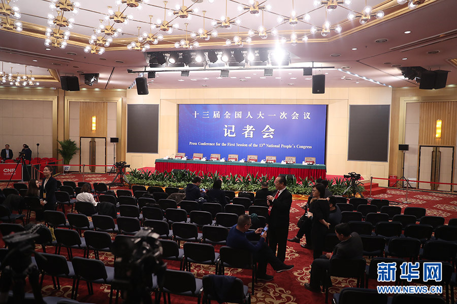 3月12日,十三屆全國人大一次會議新聞中心在梅地亞中心多功能廳舉行記者會,邀請十二屆全國人大內司委副主任委員王勝明、財經委副主任委員烏日圖、教科文衛(wèi)委副主任委員吳恒、環(huán)資委委員呂彩霞,全國人大常委會法工委副主任王超英、副主任許安標就“人大立法工作”相關問題回答中外記者提問。圖為記者會開始前。新華網/中國政府網 翟子赫 攝