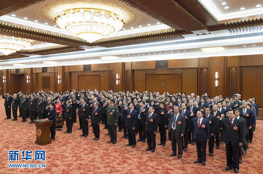 3月18日,十三屆全國人大一次會議在北京人民大會堂舉行第六次全體會議。159位候選人當選為第十三屆全國人民代表大會常務委員會委員。這是新當選的第十三屆全國人民代表大會常務委員會委員進行憲法宣誓。新華社記者 李學仁 攝