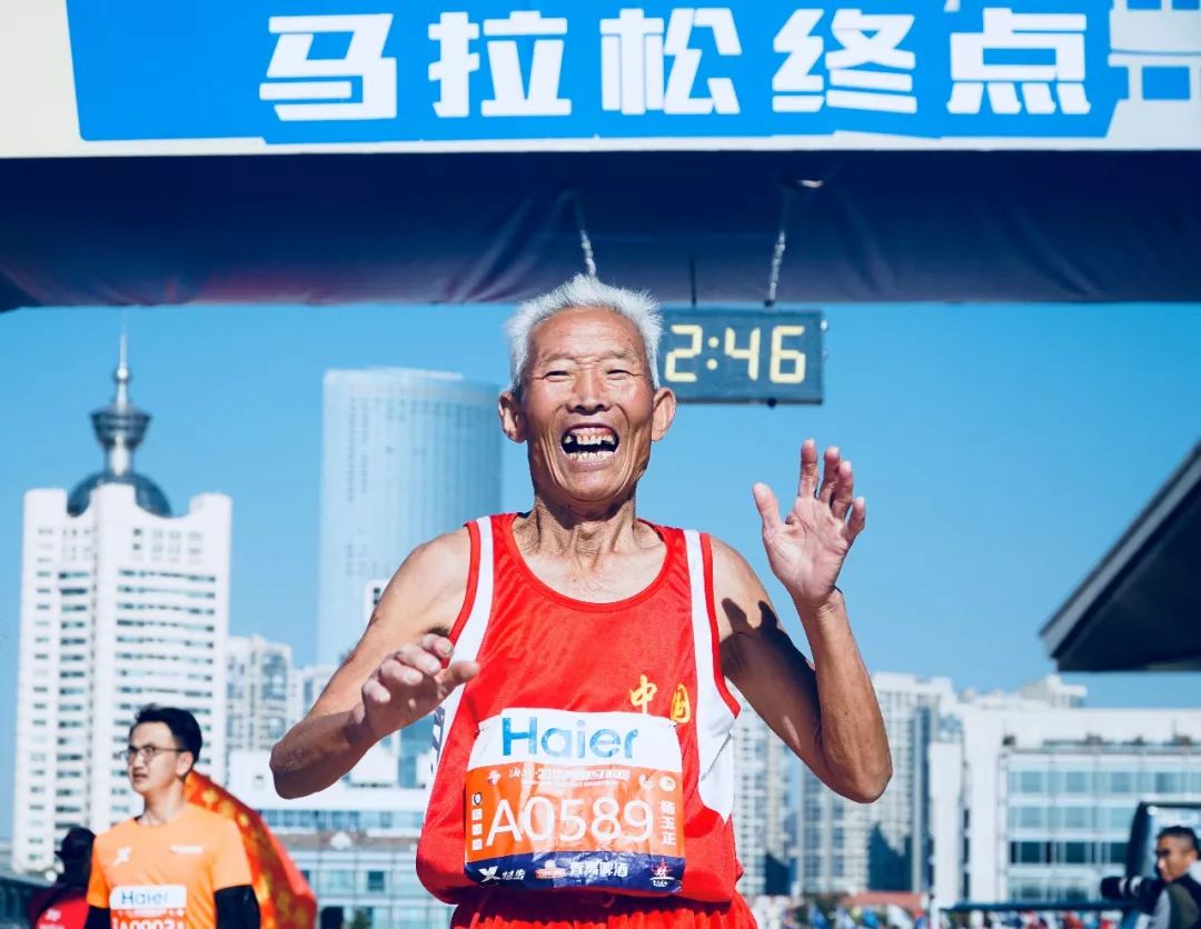 2018-10-28,青島。一名白發(fā)老人完成馬拉松后很開心。作者:feng