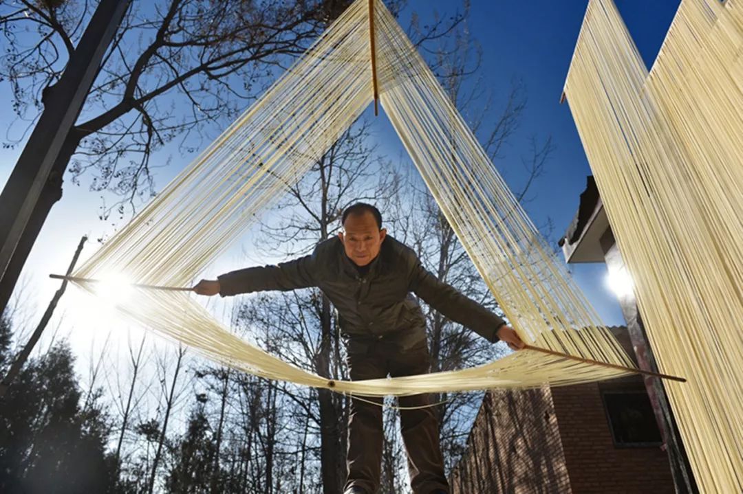 2018-12-13,河南靈寶。川口鄉(xiāng)閆謝村李潤澤正在自家院子里制作掛面。作者:紫色光