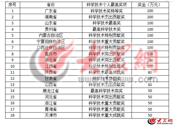 至于獎金的用途,海報新聞記者注意到,大多數省份要求,一部分屬獲獎者個人所得,其余部分都要用作科學研究經費。如廣東省科學技術獎特等獎獎金為每人200萬元,其中50萬元獎勵個人,150萬元用于資助獲獎者主持的自主創新活動;山東省科學技術最高獎獎金數額每人100萬元。其中,40萬元屬獲獎者個人所得,60萬元由獲獎者自主選題,用作科學研究經費等。(記者 張穩)