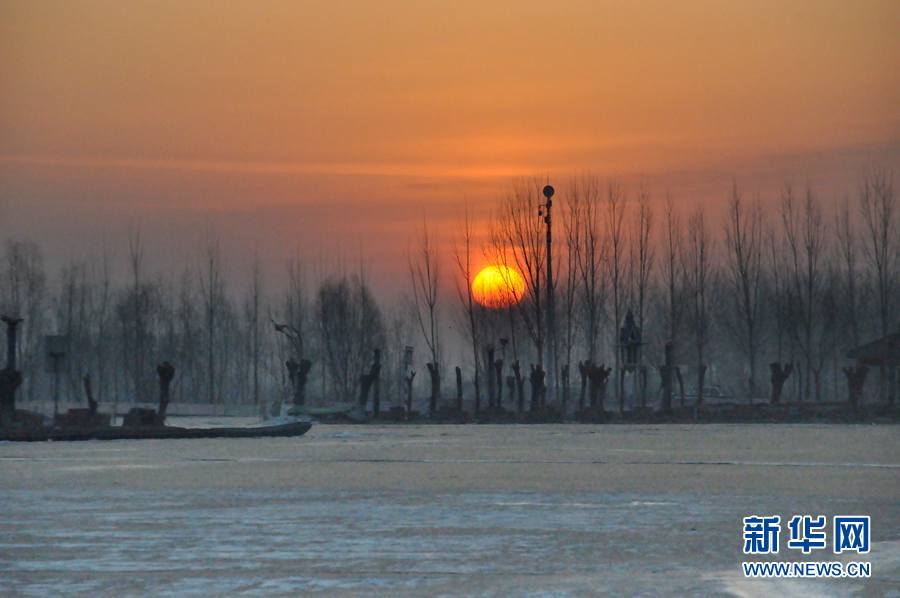 1月16日,白洋淀上朝陽正冉冉升起。新華網發(馬曉 攝)