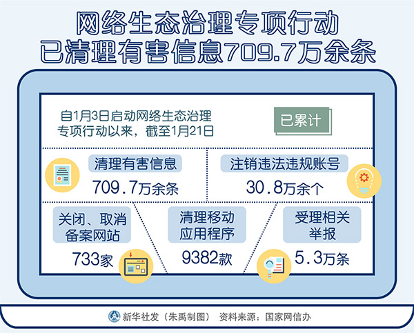 圖表:網(wǎng)絡(luò)生態(tài)治理專項(xiàng)行動已清理有害信息709.7萬余條 新華社發(fā) 朱禹 制圖