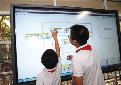 北京十八中學(xué)教育集團(tuán)課程展示活動(dòng)中的樂高機(jī)器人課上,學(xué)生正在為機(jī)器人編程。資料圖片/記者 王遠(yuǎn)征 攝