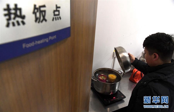 1月22日,李翔在新鄉東站熱飯點為妻子加熱晚餐。新華社記者 李安 攝