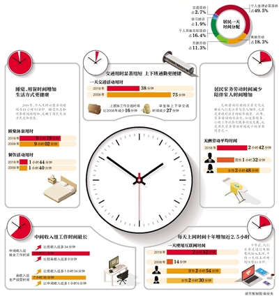 調(diào)查結(jié)果顯示,在一天的活動(dòng)中,居民個(gè)人生理必需活動(dòng)平均用時(shí)11小時(shí)53分鐘,占全天的49.5%;有酬勞動(dòng)平均用時(shí)4小時(shí)24分鐘,占18.3%;無(wú)酬勞動(dòng)平均用時(shí)2小時(shí)42分鐘,占11.3%;個(gè)人自由支配活動(dòng)平均用時(shí)3小時(shí)56分鐘,占16.4%;學(xué)習(xí)培訓(xùn)平均用時(shí)27分鐘,占1.9%;交通活動(dòng)平均用時(shí)38分鐘,占2.7%。