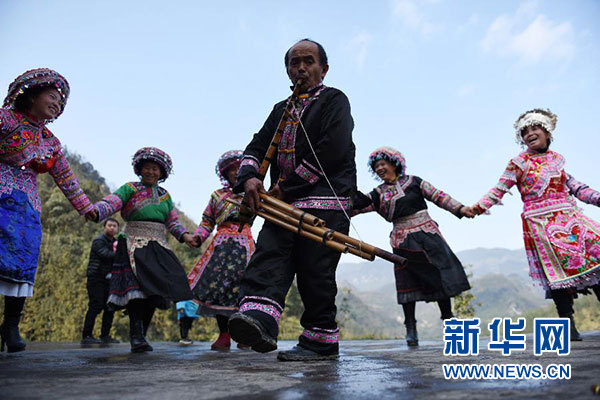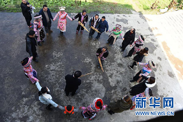 四川省敘永縣后山鎮(zhèn)三斗米村苗族村民與游客一起跳蘆笙舞(1月16日攝)。新華社記者 陳天湖 攝