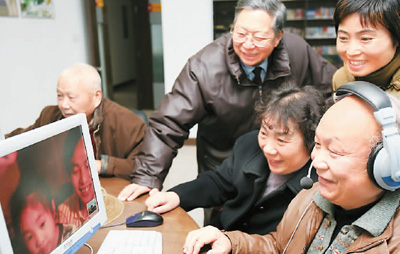 家住杭州的張淼林夫婦通過網絡視頻和美國的兒子一家通話,6歲的孫女在網上給爺爺奶奶拜年。資料圖片
