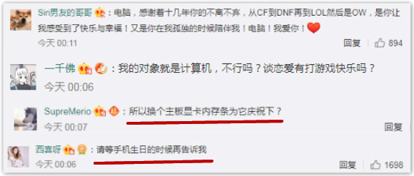 有網友表示,對廣大“單身狗”來說,平時陪伴自己時間最多,最了解自己的就是電腦了。因此,今天最重要的事就是為電腦慶祝生日。這條建議迅速得到其他網友的熱烈響應,網友“SupreMerio”提議,今天要為電腦更換主板顯卡和內存條來慶祝。