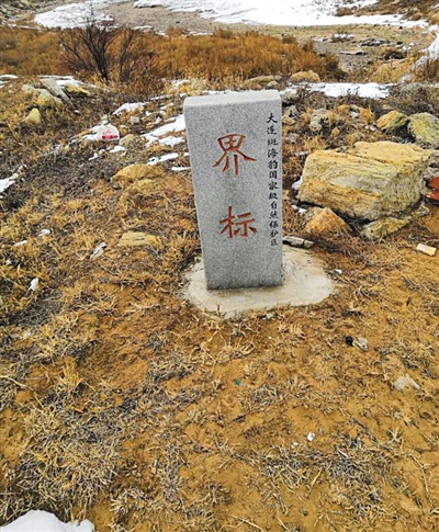 長(zhǎng)興島上的大連斑海豹國(guó)家級(jí)自然保護(hù)區(qū)界碑。受訪(fǎng)者供圖