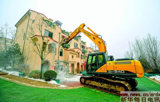 ▲2月19日,大型機械在拆除石家莊市鹿泉區“西美金山湖”房地產項目違規別墅。本報記者王曉攝