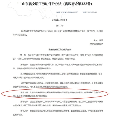 昨天,新京報記者從相關部門獲得的一份發布會文字資料顯示,為保護女職工在勞動中的安全與健康,維護女職工合法權益,制定了《辦法》《辦法》共26條,經山東省政府第28次常務會議通過,2019年1月16日簽發公布,自2019年3月1日起施行。