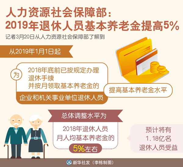 新華社北京3月20日電(記者葉昊鳴)記者20日從人力資源社會保障部了解到,從2019年1月1日起,為2018年底前已按規定辦理退休手續并按月領取基本養老金的企業和機關事業單位退休人員提高基本養老金水平,總體調整水平為2018年退休人員月人均基本養老金的5%左右,預計將有1.18億名退休人員受益。