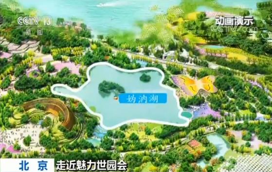 央視記者羅子瑛說,幾年前媯水河的南岸還是一片田野,2014年5月當園區的規劃者走到媯水河的拐彎處,這個位置,往北他們看到了媯水河最為寬闊的水面,而水面之上就是著名的冠帽山,往西北方向看則是小海坨山,山川形勝,圖畫天然。從這個被規劃者稱為“自然感動點”的位置出發,引山水入園,沿著兩條延長線進行規劃,形成了現在園區的兩條軸線,山水園藝軸和世界園藝軸。