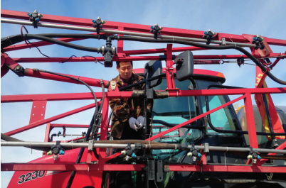 3月7日,黑龍江省孫吳縣樺林現(xiàn)代農(nóng)機(jī)專業(yè)合作社理事長(zhǎng)吳德顯正在檢修大型噴藥機(jī) 王建攝/本刊