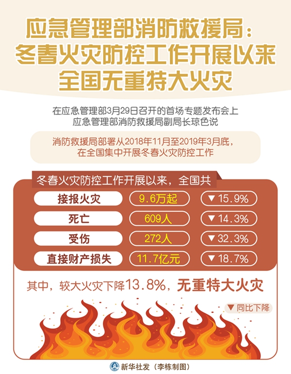 新華社北京3月29日電(記者葉昊鳴)“冬春火災(zāi)防控工作開展以來,全國共接報火災(zāi)9.6萬起、亡609人、傷272人、直接財產(chǎn)損失11.7億元,四項指數(shù)同比分別下降15.9%、14.3%、32.3%和18.7%。其中,較大火災(zāi)下降13.8%,無重特大火災(zāi)。”應(yīng)急管理部消防救援局副局長瓊色說。