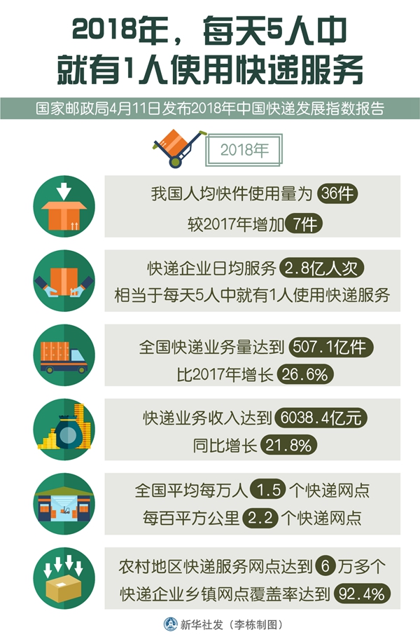 新華網北京4月12日電(記者 李志強)11日,國家郵政局發布《2018年中國快遞發展指數報告》(以下簡稱《報告》)。《報告》顯示,2018年,中國快遞業務量超過美、日、歐發達經濟體之和,規模連續五年穩居世界第一,成為全球快遞包裹市場發展的動力源和穩定器。