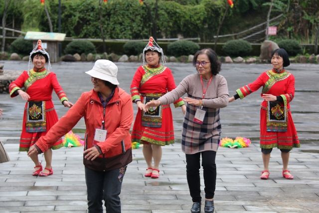 臺灣少數民族文化經貿交流參訪團代表與太源畬族鄉畬民一起舞蹈現場。(李娜 攝)