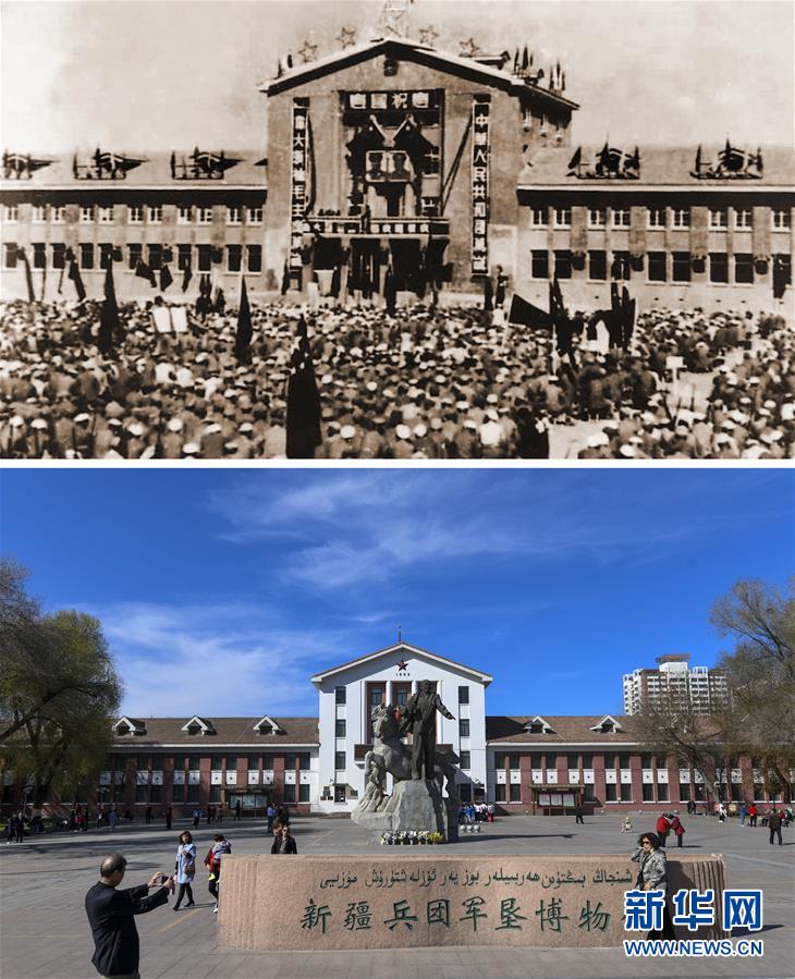 拼版照片:上圖為1952年10月拍攝的在石河子落成的中國人民解放軍第二十二兵團司令部機關辦公大樓(新疆兵團軍墾博物館提供);下圖為基于該建筑改建后的新疆兵團軍墾博物館(新華社記者王菲4月9日攝)。新華社發(fā)