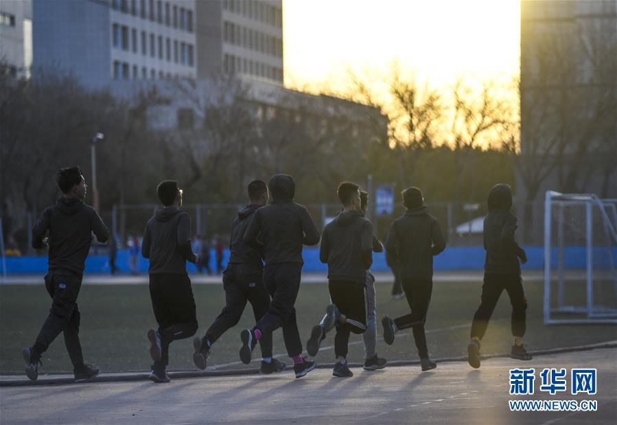 在新疆石河子大學一處操場上晨練的學生(4月10日攝)。新華社記者 王菲 攝