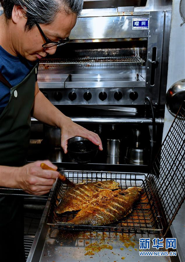 臺北市“一品言”餐館老板兼大廚劉添吉在加工烤魚(4月24日攝)。新華社記者 張國俊 攝