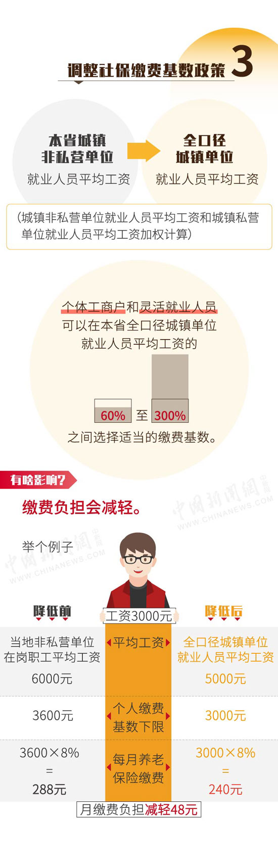 另一個(gè)含金量比較高的政策就是調(diào)整社保繳費(fèi)基數(shù)。改用全口徑城鎮(zhèn)單位就業(yè)人員平均工資來(lái)核定個(gè)人繳費(fèi)基數(shù)上下限,比原政策規(guī)定的非私營(yíng)單位在崗職工平均工資,能夠更合理地反映參保人員實(shí)際平均工資水平,部分工資水平較低的職工和企業(yè)繳費(fèi)基數(shù)可相應(yīng)降低,繳費(fèi)負(fù)擔(dān)會(huì)減輕。