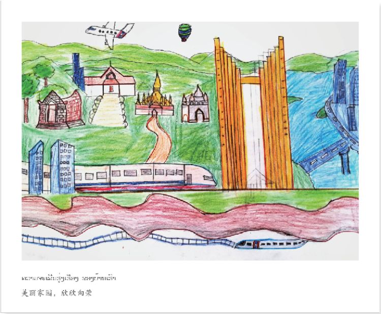 58幅天真爛漫的畫作,寓意中老建交58周年的深情厚誼。孩子們希望通過畫中的學校、家鄉、世界和夢想,展示“一帶一路”為他們的生活帶來的變化,與習近平主席分享心中滿滿的喜悅和幸福。
