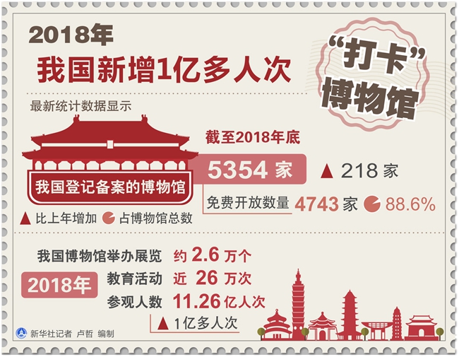 新華社長沙5月18日電(記者施雨岑、柳王敏)最新統(tǒng)計數(shù)據(jù)顯示,2018年,我國博物館舉辦展覽約2.6萬個,教育活動近26萬次,參觀人數(shù)達(dá)11.26億人次,比上年增加1億多人次。