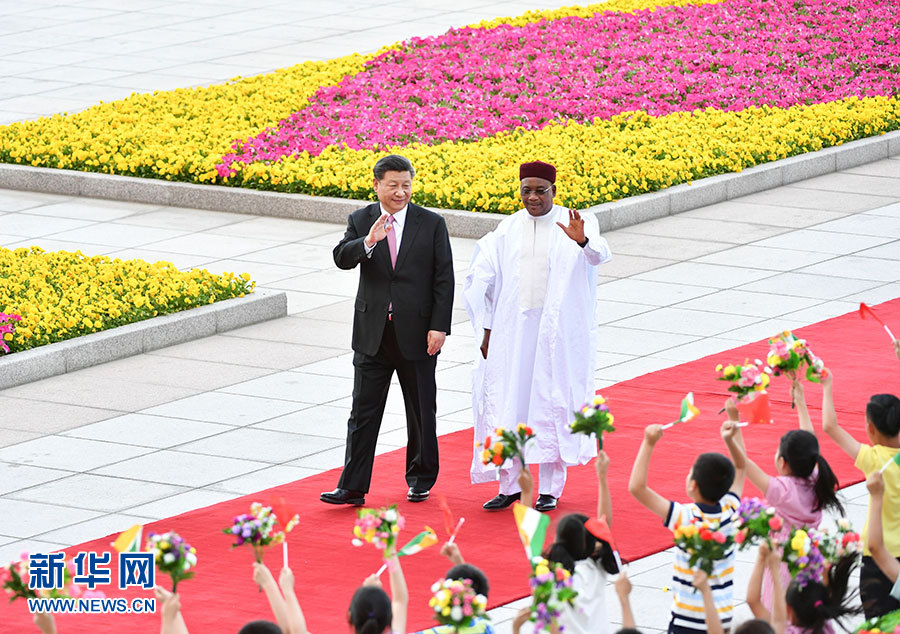 5月28日,國(guó)家主席習(xí)近平在北京人民大會(huì)堂同尼日爾總統(tǒng)伊素福舉行會(huì)談。這是會(huì)談前,習(xí)近平在人民大會(huì)堂東門外廣場(chǎng)為伊素福舉行歡迎儀式。 新華社記者 劉衛(wèi)兵 攝