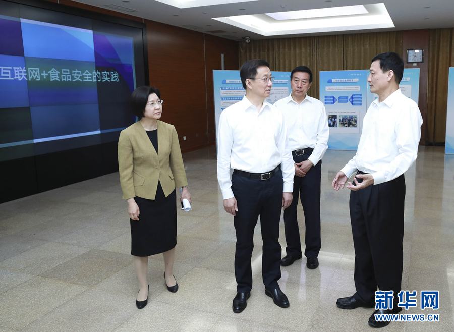 6月13日,在2019年全國食品安全宣傳周活動前夕,中共中央政治局常委、國務院副總理、國務院食品安全委員會主任韓正到國務院食品安全委員會辦公室主持召開座談會,聽取對食品安全工作的意見建議。這是會前,韓正參觀食品安全工作情況展示,考察了解食品安全智慧監(jiān)管的創(chuàng)新舉措。 新華社記者 龐興雷 攝