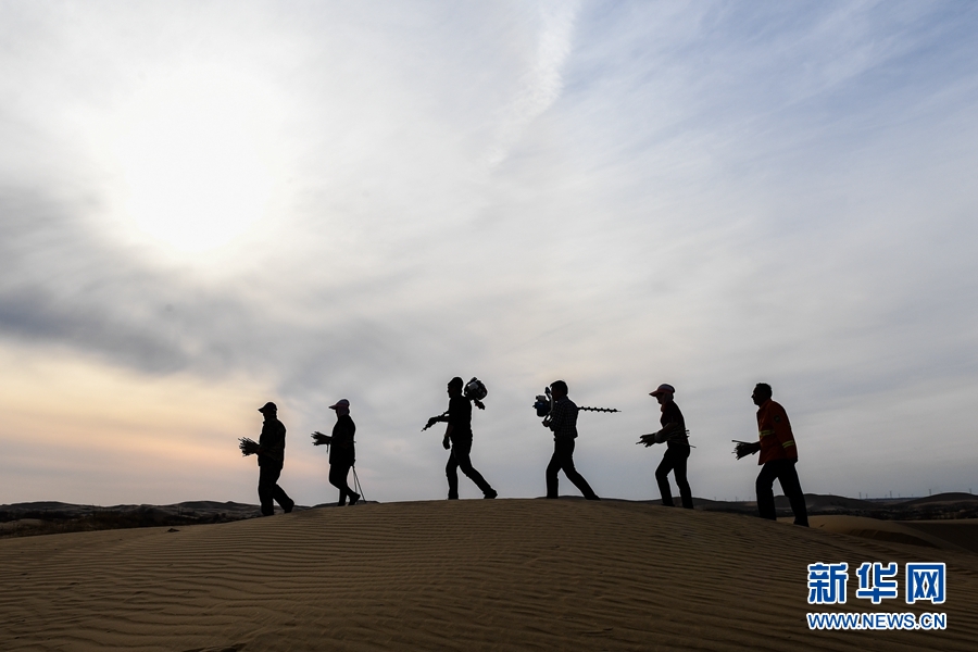 4月1日,在內(nèi)蒙古鄂爾多斯市達拉特旗銀肯塔拉的沙漠中,治沙工人前往一處種植點。新華社記者 劉磊 攝