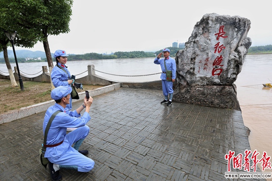 6月12日,中央紅軍長征第一渡紀念碑園,游客在長征渡口碑前拍照。 中國青年報·中青在線記者 李建泉/攝
