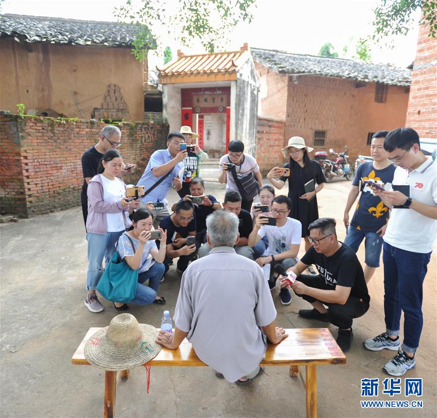 6月22日,在廣東省南雄市烏逕鎮新田村,媒體記者在紅軍入粵第一仗舊址采訪廣東省南雄市史志辦原副主任李君祥(中)。新華社記者 李任滋 攝