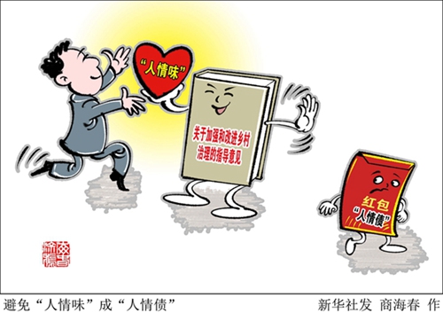 近日,中辦、國辦印發《關于加強和改進鄉村治理的指導意見》。意見提出,全面推行移風易俗,整治農村婚喪大操大辦、高額彩禮、鋪張浪費、厚葬薄養等不良習俗。依靠群眾因地制宜制定村規民約,提倡把喜事新辦、喪事簡辦、弘揚孝道、尊老愛幼、扶殘助殘、和諧敦睦等內容納入村規民約。