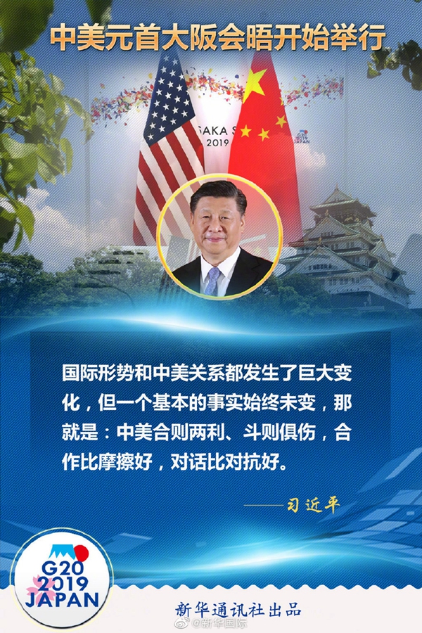 習(xí)近平在會晤開始時說,很高興同總統(tǒng)先生在大阪見面。48年前,也就是1971年,就在離這里100多公里的名古屋,參加第三十一屆世界乒乓球錦標(biāo)賽的中美乒乓球運(yùn)動員進(jìn)行了友好互動,這就是后來人們說的“乒乓外交”的開啟,創(chuàng)造了“小球轉(zhuǎn)動大球”的歷史佳話。8年之后的1979年,中美建立了外交關(guān)系。回顧建交以來的40年,國際形勢和中美關(guān)系都發(fā)生了巨大變化,但一個基本的事實始終未變,那就是:中美合則兩利、斗則俱傷,合作比摩擦好,對話比對抗好。近來,我同總統(tǒng)先生通過電話和書信保持著密切聯(lián)系。今天,我愿同總統(tǒng)先生就事關(guān)中美關(guān)系發(fā)展的根本性問題交換意見,為下階段兩國關(guān)系發(fā)展定向把舵,推進(jìn)以協(xié)調(diào)、合作、穩(wěn)定為基調(diào)的中美關(guān)系。